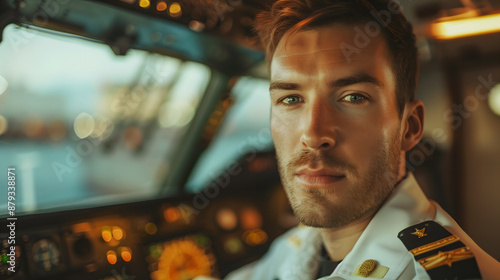 Un jeune capitaine de bateau en uniforme regardant attentivement depuis la cabine de pilotage avec des instruments de navigation en arrière-plan.