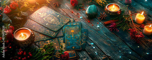 A spread of tarot cards with intricate designs sits on a dark wooden table surrounded by lit candles, flowers, and other decorative items