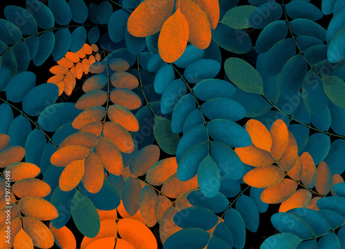 Fundo, folhas, estampa, padrão, folhagem, padrão, azul, laranja, ornamento, textura, jardim, botânico, tropical, inverno, outono, floral, florescer, fundo lettering, natureza, floresta, místico, magia
