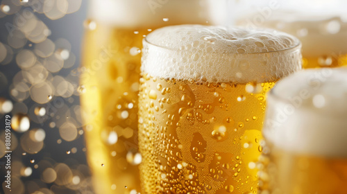 '' Closeup of frothy beer steins clinking together, golden beer splashing, Oktoberfest celebration, warm lighting, detailed texture of condensation on the glasses
