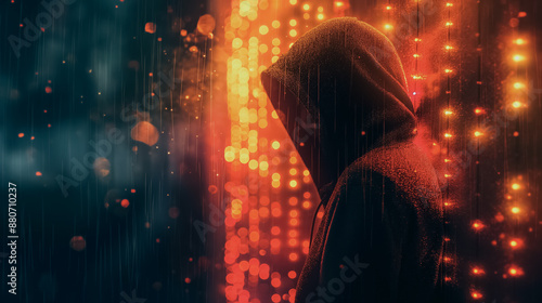 A person is standing in the rain with a hood over their head. The image has a moody and mysterious feel to it, as the person is partially obscured by the hood and the rain creates a sense of darkness