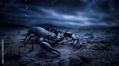 A large black scorpion is on the ground in front of a dark sky. Scene is mysterious and eerie, as the scorpion is the only living creature in the scene