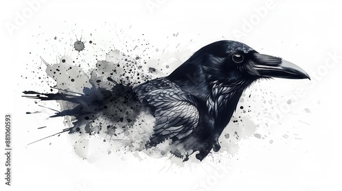 A stylized black crow with a splash of gray and white paint, creating a dramatic and artistic image.