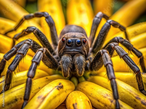 Vibrant yellow bananas provide a striking backdrop for a closeup of the notorious Brazilian wandering spider, its sleek black body and menacing eyes on full display.