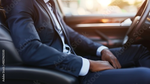 Cropped shot of a businessman sitting in a car, focusing on the professional appearance and modern lifestyle associated with commuting and business travel
