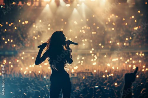 talented female pop star singer delivering an electrifying concert performance in front of a massive crowd at a stadium, showcasing her charisma and musical prowess. Ideal for prom