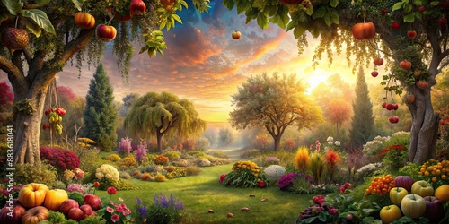 Garden of Eden post-fall, with vibrant beauty tarnished by sin , Eden, Adam and Eve, biblical, paradise lost