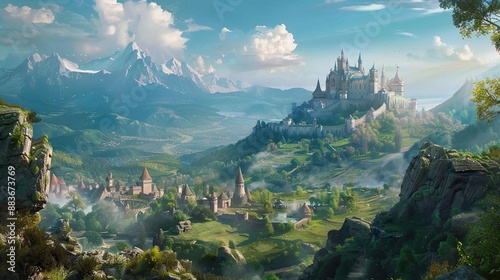 A fantasy kingdom with majestic castles, rolling hills, and mythical creatures roaming the land