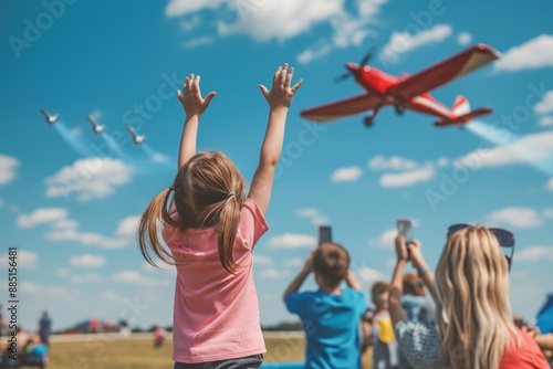 Joyful kids watching a vibrant airshow with planes performing stunts and colorful trails in a clear blue sky. National Aviation Day