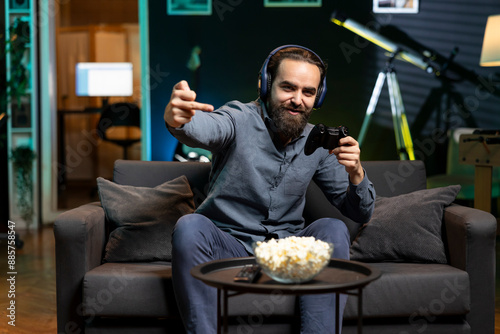 Cheerful man showing middle finger signs, celebrating videogame victory after conquering all rival players. Gamer doing crass hand gestures, excited after winning game, displaying happiness emotions