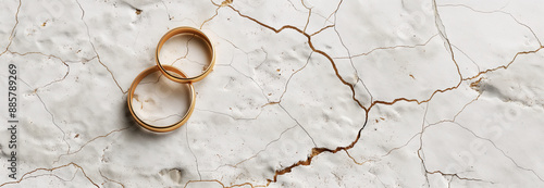 Golden wedding rings on cracked surface with copy space, broken marriage concept