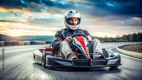 Man racing on karting track at full speed wearing helmet and driver suit, karting, race, speed, adrenaline, competition, sport