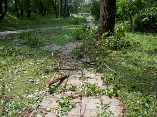Połamane gałęzie leżące na chodniku po intensywnej wichurze