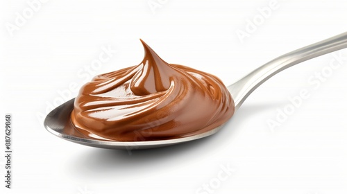 A spoonful of chocolate spread is shown on a white background. The spoon is curved and the chocolate is thick and creamy. Concept of indulgence and comfort