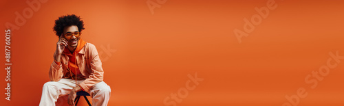Curly African American man, stylishly dressed, sitting on chair on orange background.