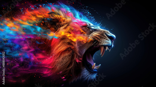 A colorful lion with its mouth open, spewing fire
