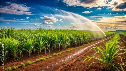 Sugarcane Field Irrigation Under Blue Sky, Agriculture , Irrigation , Farmland , Sugarcane