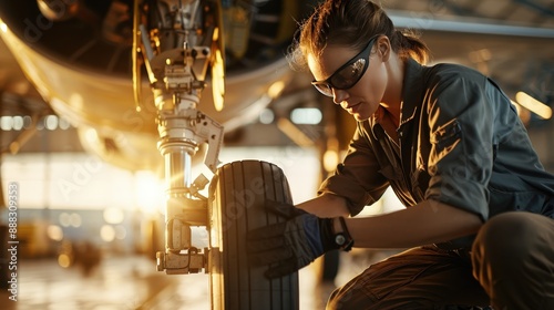A female aircraft mechanic working on the landing gear of a vintage airplane in a hangar.