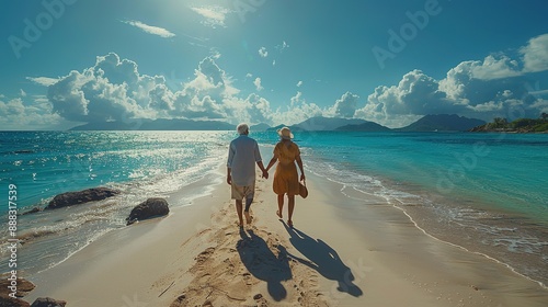Elderly intelligent couple in love spending time romantically on the beach near the sea, walking holding hands and gently hugging.