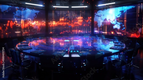 high-resolution depiction of a strategic financial meeting, visualized as a digital round table with virtual reality projections of global markets
