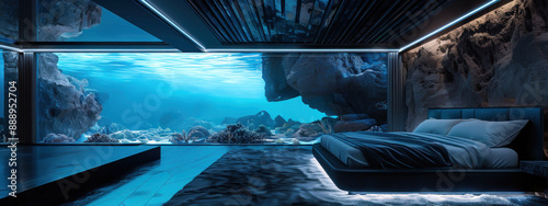 Une chambre à coucher moderne et élégante dans une grotte sous-marine, avec de grandes fenêtres donnant sur l'océan et les rochers à l'extérieur.
