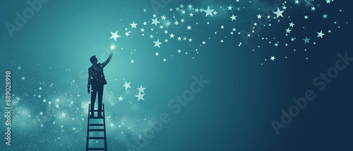 A businessman standing on a ladder reaching for the stars of innovation