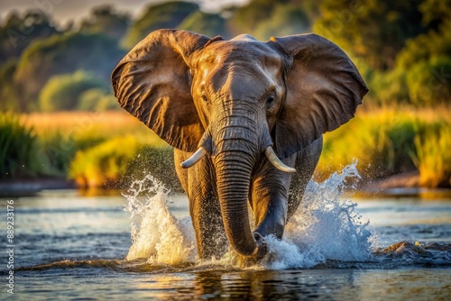 Majestic African elephant runs freely through calm river waters, splashing and sending droplets flying, its wrinkled gray skin glistening in the warm safari sunlight.