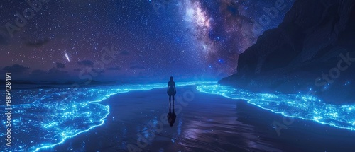 Silhouette of a person standing on a bioluminescent beach, gazing at the Milky Way galaxy 10 Underwater view of a bioluminescent beach, fish swimming through glowing water , 3D style