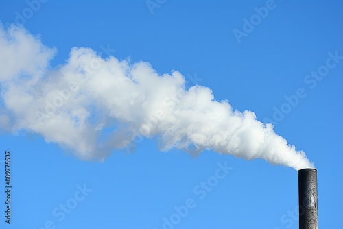 A thick plume of smoke billows from a tall industrial chimney, disappearing into a bright blue sky
