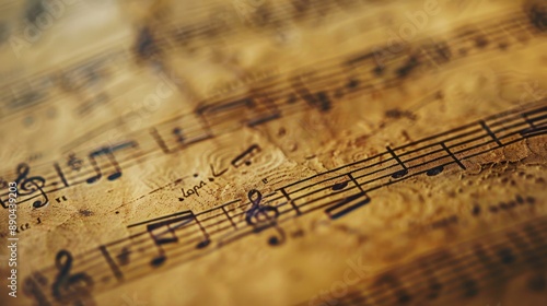 Vintage sheet music, closeup of intricate notes, aged texture, realistic studio lighting, high detail and vivid