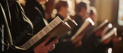 A serene choir engrossed in singing, holding hymn books under warm, diffused lighting, creating a peaceful and reverent atmosphere.