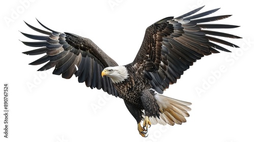 A stunning image capturing a bald eagle in mid-flight, showcasing its powerful wings and intense gaze.