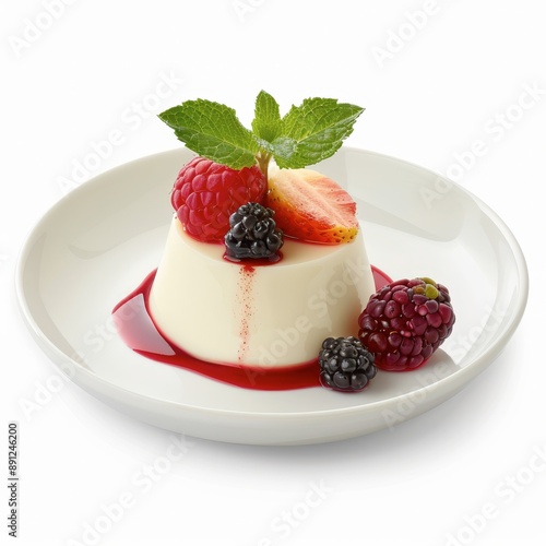 A delicate panna cotta dessert with fruit garnish, Italian cuisine, realistic, isolated on white background