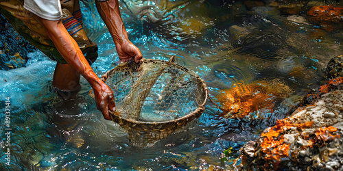 The Ancient Art: A fisherman using a traditional net dipping for shrimp in a shallow stream