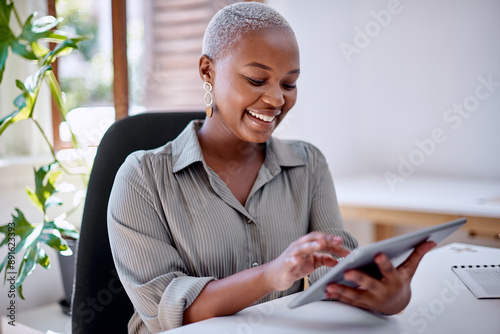 Working, black woman and tablet with ideas as intern, junior and financial advisor in insurance company. Female person, serious and tech in office, building or firm as professional in business or job