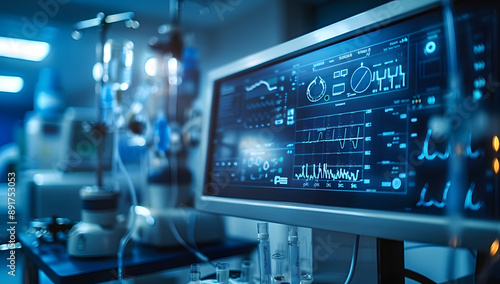 Vital Signs Data with Operating Table and Life Support Machines in Dark Blue Aesthetic