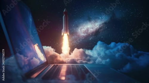 Rocket Launching from Laptop in Cosmic Background created by ai