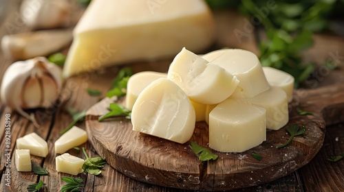 semi-hard cheese with a mild and smoky flavor, often aged to develop a sharper taste, used in sandwiches, pizzas, and as a melting cheese.