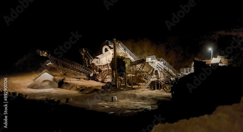 Kamieniołom nocą - oświetlona maszyna do frakcjonowania materiału skalnego. Kamieniołom wyglądający jak stacja kosmiczna, oświetlony nocą, z zestawem maszyn, taśmociągów itp. do mielenia żwiru i skał.