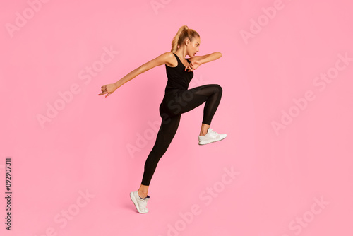 Fitness. Young Lady Jumping During Cardio Workout On Yellow Studio Background. Side View