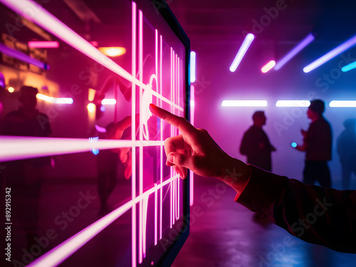 Mano tocando una pantalla con una vibrante escena de rayos de luz rosa iluminada con luces de neón violeta y azul
