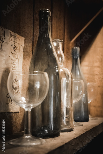 Antique bottles and glasses on a shelf in a wine cellar.