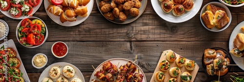 An overhead view of a wooden table filled with a variety of appetizers and hors d'oeuvres, ready for a party