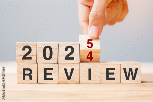 hand flipping block 2024 to 2025 REVIEW text on table. Resolution, idea, goal, motivation, reboot, business and New Year holiday concepts