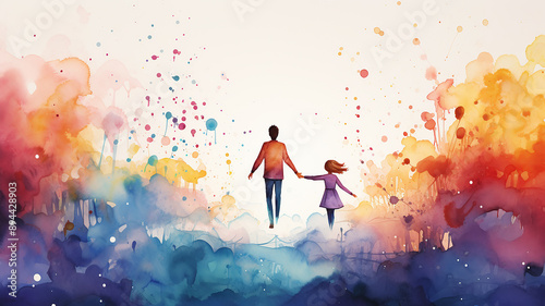 watercolor spots of freedom multicolored ink on a white background, silhouette of group people, idea creativity, friendship family training