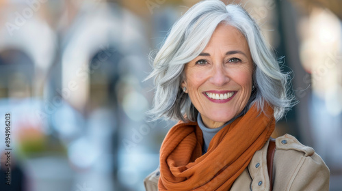 Smiling senior woman with silver hair wearing a cozy orange scarf in an urban setting during a sunny day