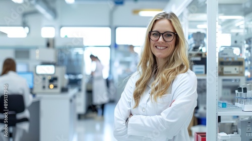 Confident Female Scientist in Modern Laboratory - A confident female scientist in a white lab coat with arms crossed, standing in a modern laboratory setting.