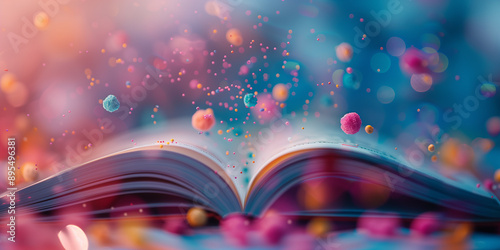 abstrakter Fotohintergrund mit Kinderbuch und fantasievollen und verspielten Elementen, fröhliche und farbenfrohe Töne, minimalistischer Stil, sanfte Farbverläufe