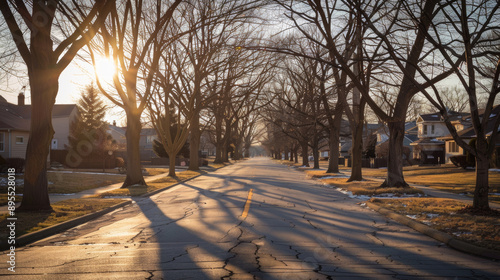 Sunlit suburban street with bare trees, casting shadows on the asphalt.