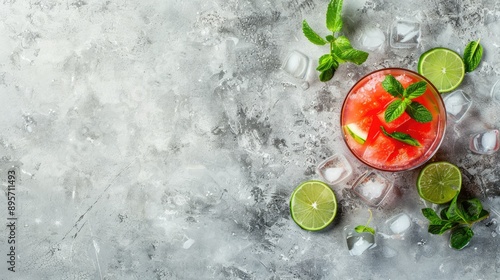 Lime watermelon margarita cocktail, light concrete background with copy space